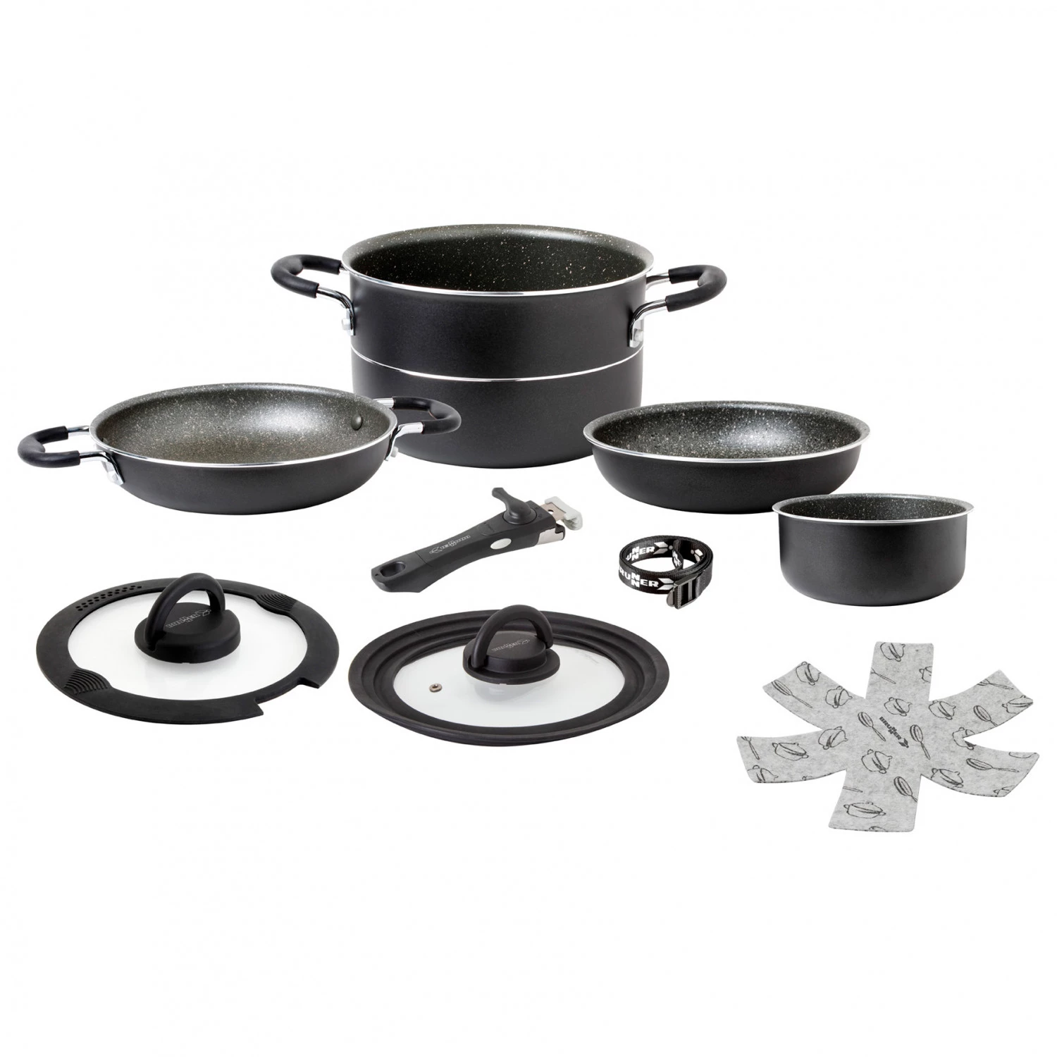 | Contenu de la livraison | 2, casseroles;, 2, poêles;, 2, couvercles;, 1, poignée;, 1, sangle |