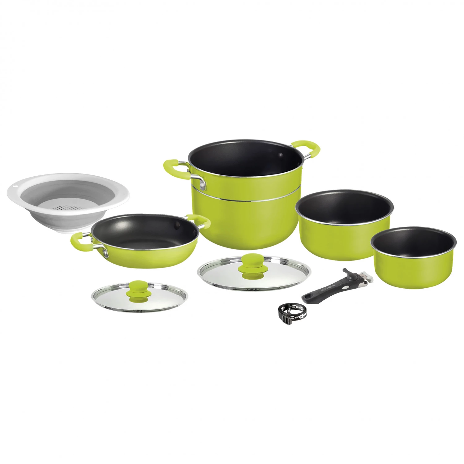 | Contenu de la livraison | 3, casseroles;, 1, poêle;, 1, passoire;, 2, couvercles;, 1, poignée;, 1, sangle |